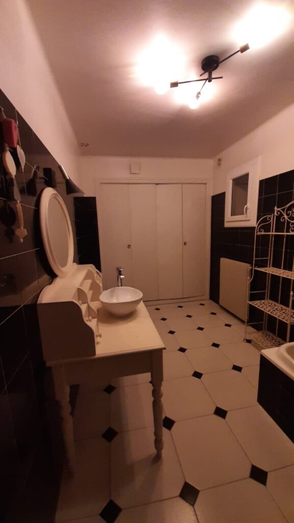Objectif : Transformer une salle de bain sombre et vieillissante en un espace moderne et élégant. L’idée était d’apporter plus de luminosité tout en valorisant le contraste noir et blanc.