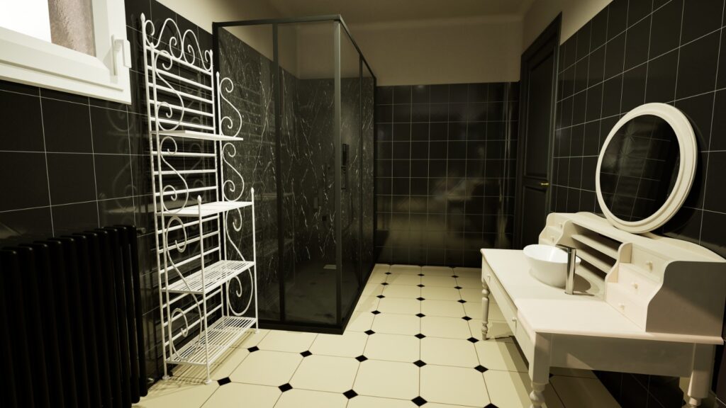 Travail en 3D : Création d’une douche à parois vitrées avec finitions effet marbre, mise en scène réaliste des matériaux et optimisation des jeux de lumière pour un rendu chic et contemporain.